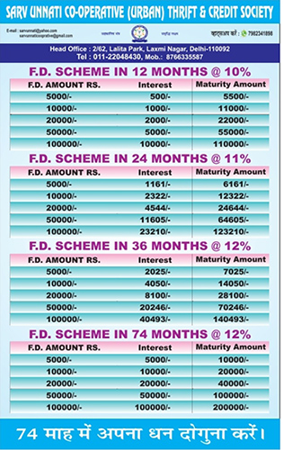 F.D. A / C | 12 Months @ 10% | 24 Months @ 11% | 36 Months @ 12% | 74 Months @ 12% |